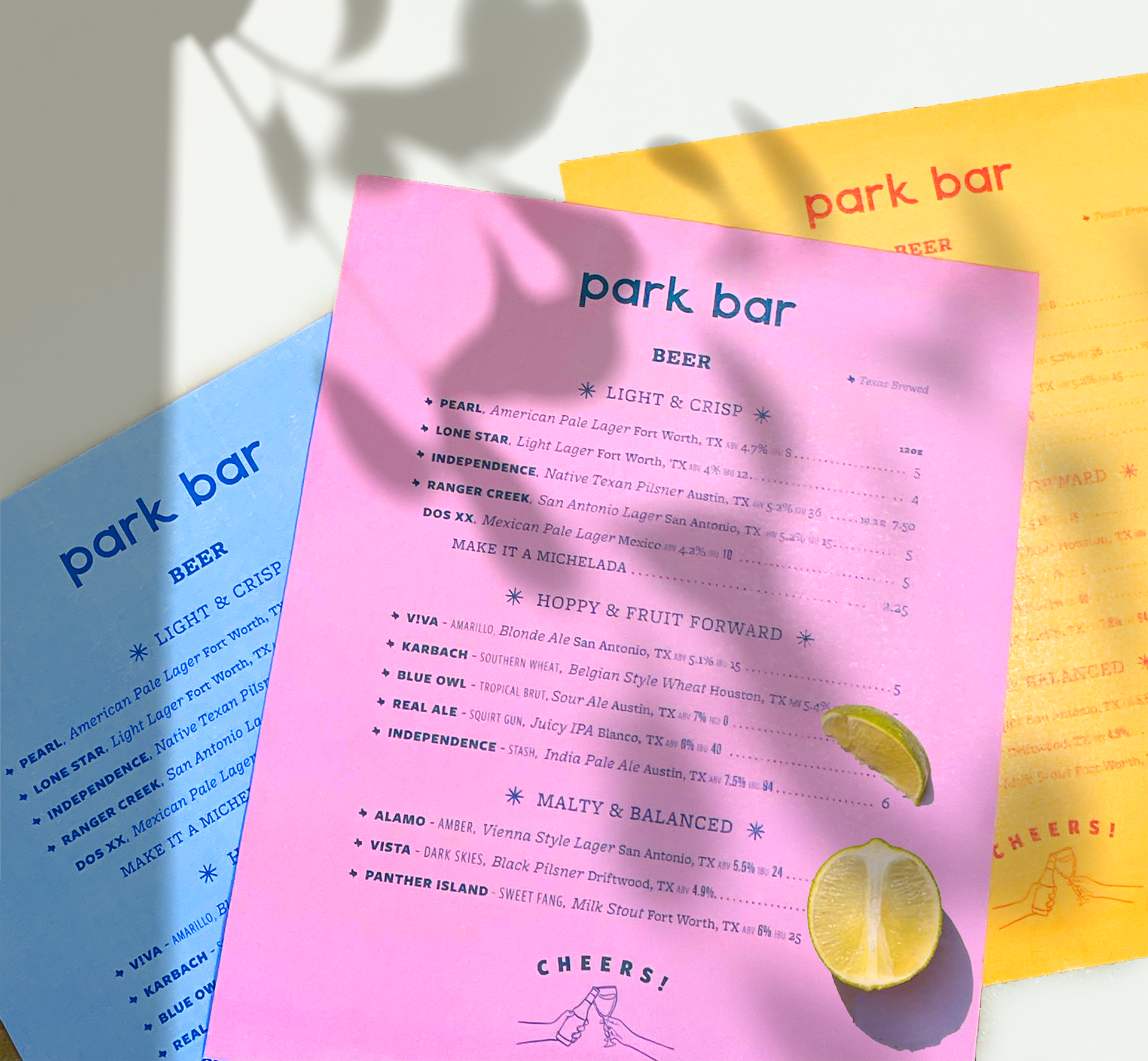 To celebrate its four year anniversary, the Bar at Pearl's Food Hall wanted a full Rebrand, complete with the new name of "Park Bar" to emphasize its park side service.