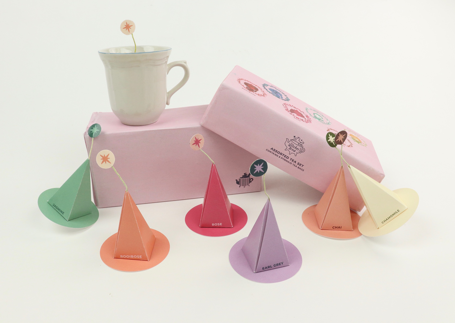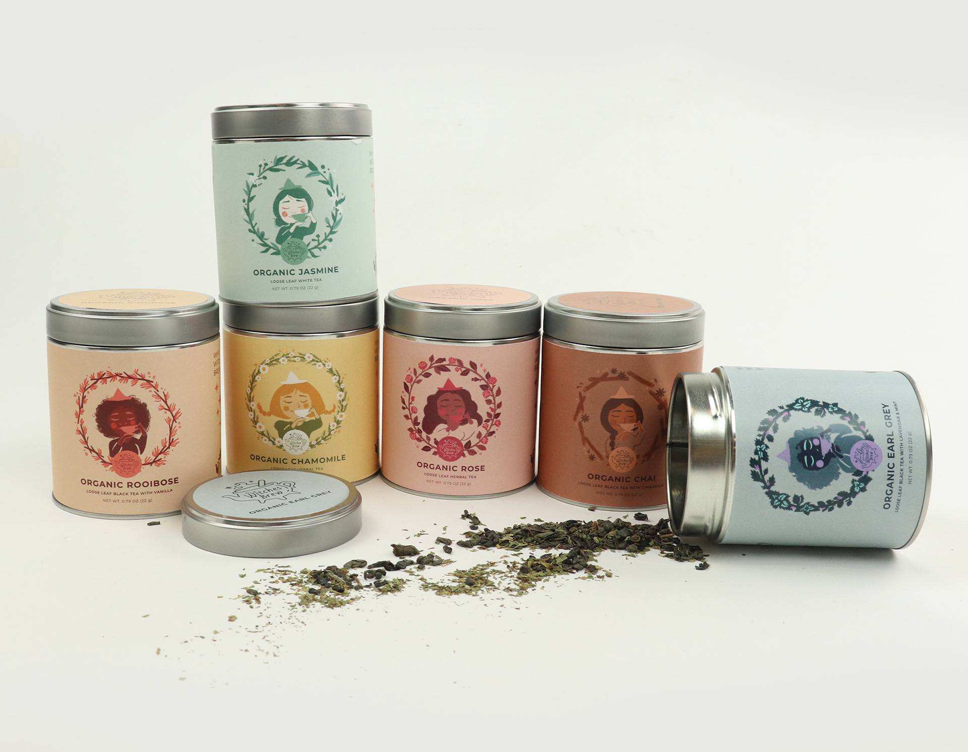 Brew a little magic in your kitchen with Witches Brew, an assortment of fine floral teas. The soft pastels of the packaging paired with the sweet little witch illustrations charm grocery shoppers & boutique vendors alike.